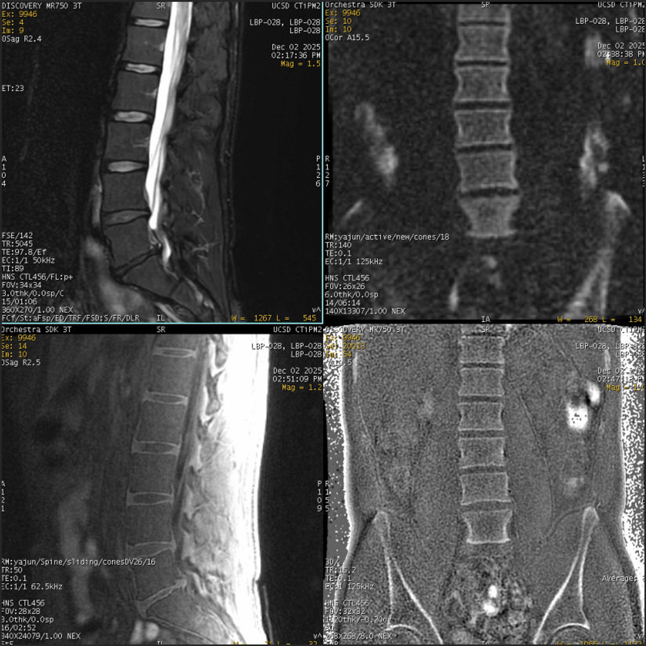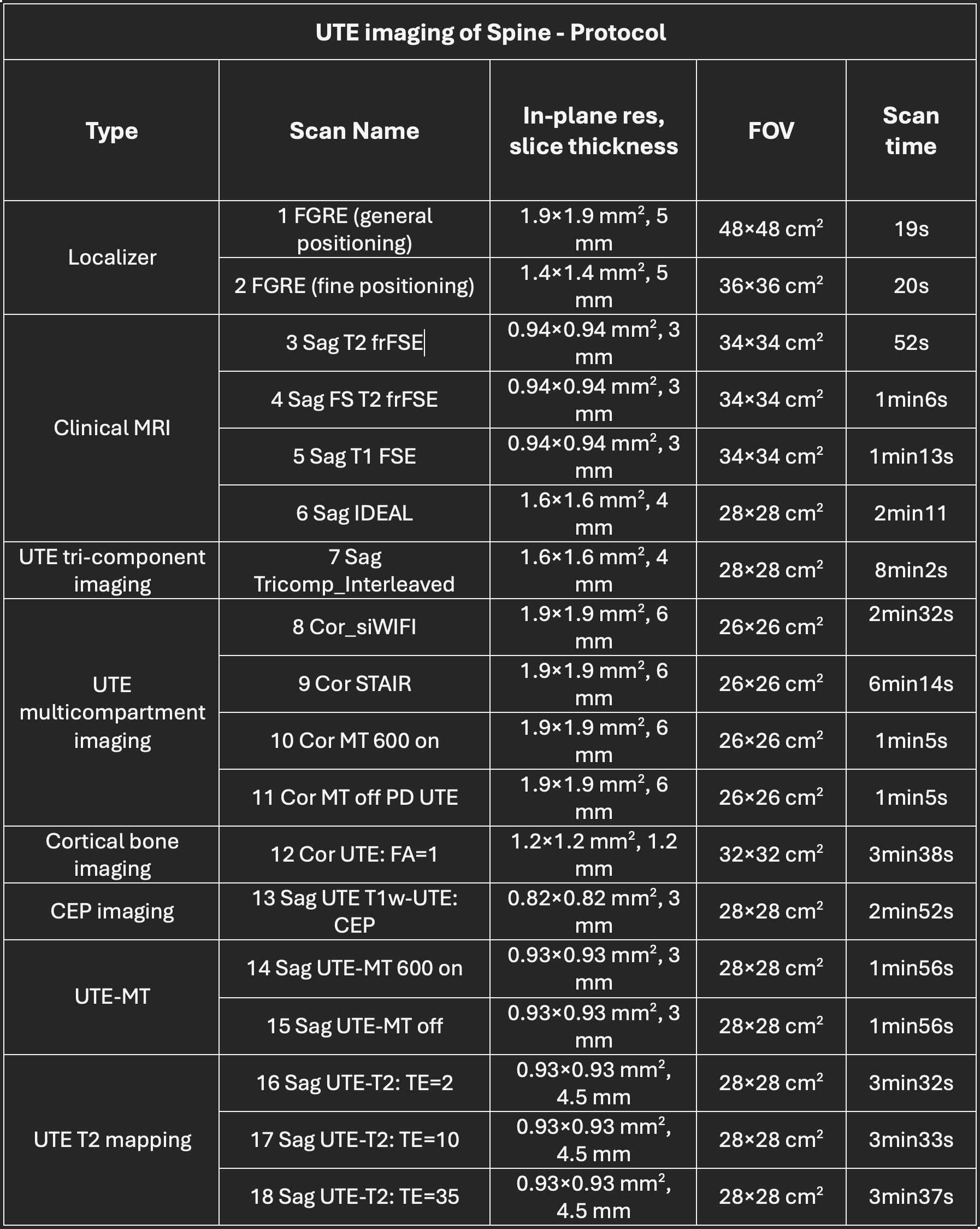Quantitative UTE imaging of the spine using UTE-T2, UTE-MT, UTE-tricomponent and UTE-multicompartment imaging.